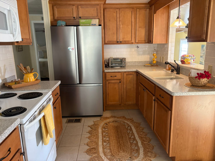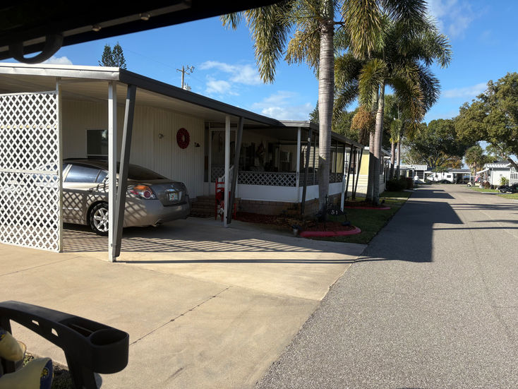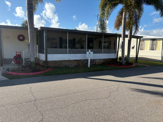 This beautifully maintained, fully furnished mobile home is located in Lakeside Village Mobile Home Park. It features 2 bedrooms, 2 bathrooms, a screened-in front porch, a bonus room at the back, a golf cart, a 3-wheel bike, and a carport for more than 2 cars on the tranquil Pine Aire Circle. The home boasts a new roof and gutters installed in 2025, a new A/C unit from 2023, additional driveway space added in 2022, and a freshly painted driveway in 2025. The kitchen and both bathrooms have been remodeled, and the home is finished with carpet and laminate floors. There's also a 4 Season Florida Room at the back. The lot rent is $805.50, covering lawn mowing, garbage pickup twice a week, water, sewer, and taxes—everything except electric, internet, cable TV, and personal landscaping maintenance. For an appointment, call (863) 840-2622.